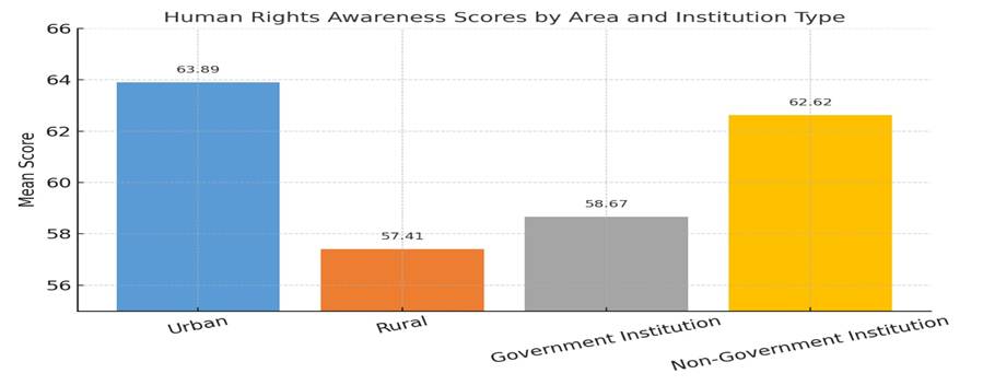 Figure 1: Mean human rights awareness scores by area and institutional affiliation (based on data from Jadav, (2016).