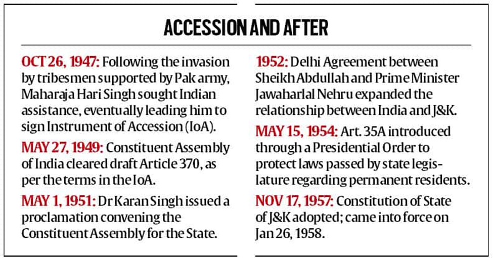 In 1927, Maharaja Hari Singh, the last Dogra monarch of Jammu and Kashmir, enacted legal protections for the people of Jammu and Kashmir, stating that no ‘foreign’ could possess land in the state or hold government jobs. This is the underlying idea that gave rise to Article 35A.2 On August 15, 1947, India gained independence from British dominion, but with the division of British India. Lord Mountbatten, India’s final governor-general, outlined the partition plan during the time in June 1947 known as “Mountbatten’s Partition Plan.”
