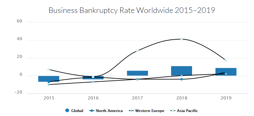 - Asia will be the key contributor to the 8% year-over-year rise in business bankruptcies in 2020.