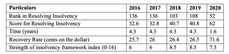 In the ‘resolving insolvency’ parameter, India’s ranking improved 56 places to 52 this year from 108 last year. As per this report, owing to the establishment of a modern insolvency regime with the enactment of the IBC, India made resolving insolvency easier by promoting reorganisation proceedings in practice. As a result, the overall recovery rate for creditors jumped from 26.5 to 71.6 cents on the dollar and the time taken for resolving insolvency also came down significantly from 4.3 years to 1.6 years.