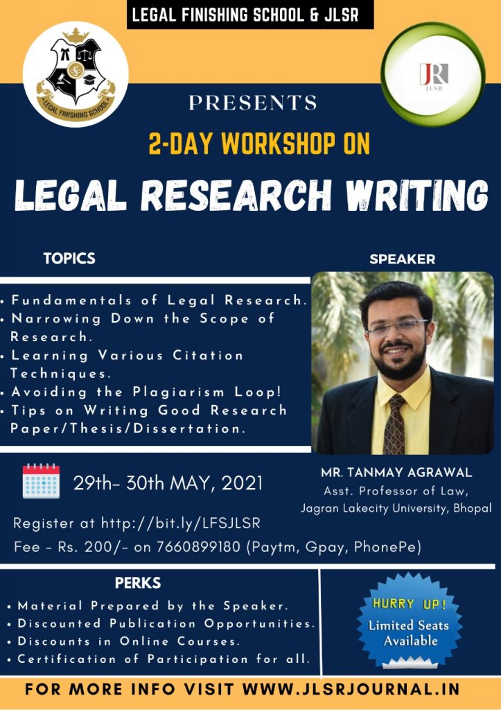 Hope you’re safe at your homes. We have again come up with unique workshop on “LEGAL RESEARCH WRITING“. You would learn the following important topics in just 2 days for improving your legal research writing by our speaker- Mr. Tanmay Agrawal, Assistant Professor, Jagran Lakecity University Bhopal who would be covering the essential tips on legal writing, how to write research papers with your contributions having an impact, narrowing down the research topic and about citation techniques..