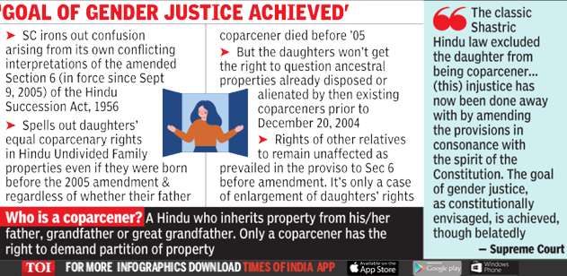 This case revolves around the issue of providing equal rights to daughters as coparceners. Prior to the 2005 Amendment, Hindu Succession Act did not provide daughters the right to become coparceners. However in the year 2005, Section 6 of the Hindu Succession Act was amended and daughters by birth were entitled to become coparceners in her own right. But this still did not lacuna and the question of whether daughters had the same coparcenary rights as the son arised and with a proviso that conferment of such right on a daughter shall not affect or invalidate any disposition or alienation, partition or testamentary disposition of property took place before 20.12.2004.